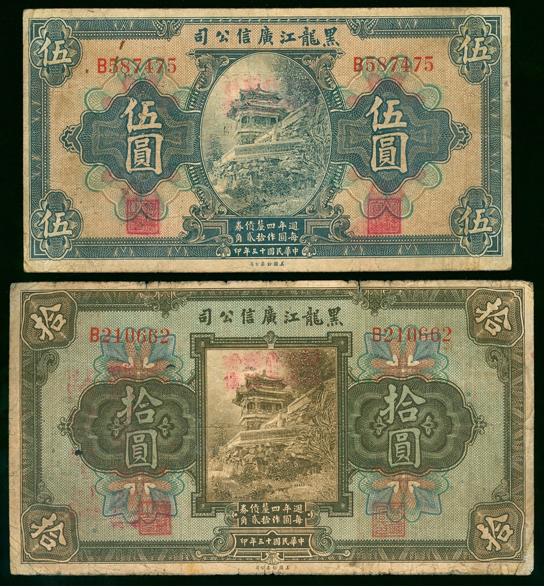 1924黑龍江廣信公司5元及10元兩枚,編號B587475及B210662,G品相,有損毀