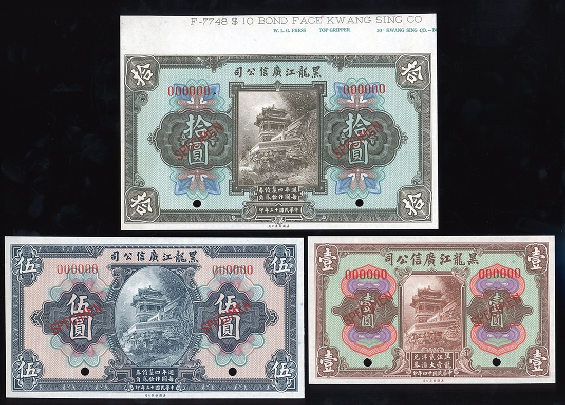 Kwang Sing Company, Heilungchiang , $1, $5, and $10, specimen set of 3, 1925, serial numbers 00000, (Pick S1614s, S1615s, S1616s), about uncirculated to uncirculated (3)