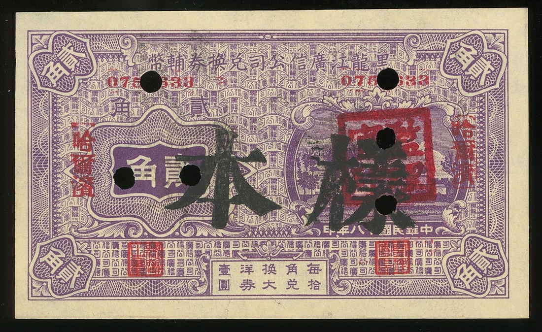 1929年黑龍江廣信公司2角樣鈔,哈爾濱地名,UNC品相