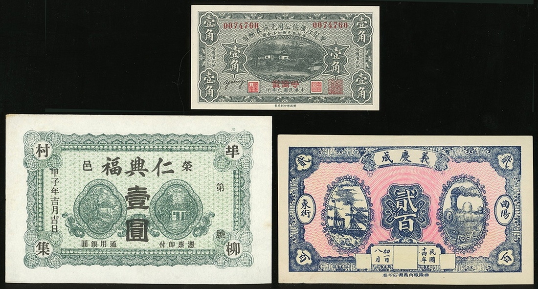 民國年間黑龍江廣信公司兌換券輔幣壹角及私鈔兩枚,包括仁興福壹圓,義慶成貳佰,共三枚一組,EF-AU,部份微黃
