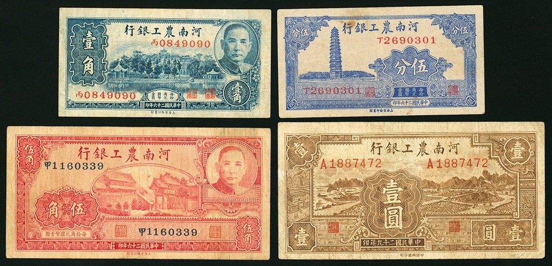 The Farmers and Industrialist Bank of Honan, a lot of 5, 10, 50 cents and 1 yuan, 1937 and 1940, serial number 2690301, 0849090, 1160339, A1887472, (Pick unlisted), about very fine to about uncirculated.(4)