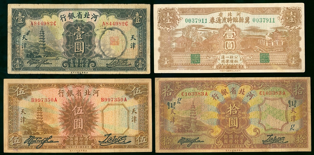 Hopei Province, a group of 4x notes by two issuing authorities in the region, Hopei Province, 1 yuan, Temporary Circulating Note, Tientsin, 1938, serial number 0037911; Bank of Hopei, 1 yuan, 5 yuan, 10 yuan, all printed in Tientsin, 1933, serial numbers A844982C, B997350A, C103383A,