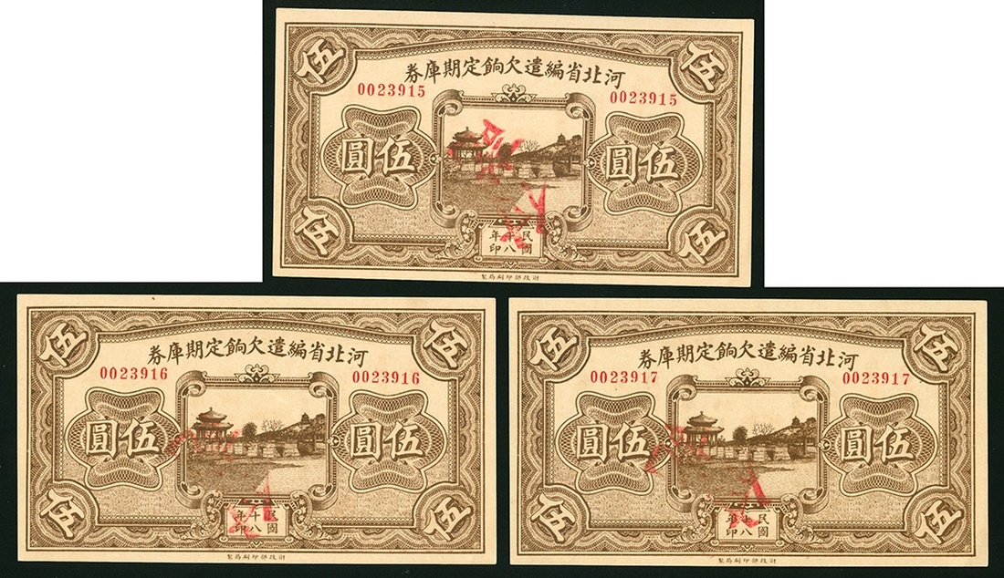 民國十八年河北省編遣欠餇定期庫券伍圓3枚連號,紅色,加蓋付訖,UNC
