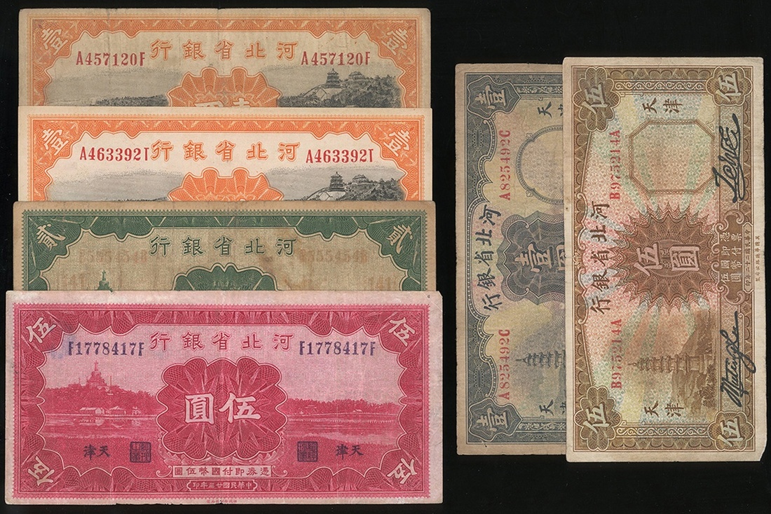 Provincial Bank of Hopei, a group of 6x notes, 1 yuan (3), 2 yuan, 5 yuan (2), Tientsin, 1933-1934, serial numbers A825492C, A4633921T, A457120F, B555454B, B975214A, F1778417F,