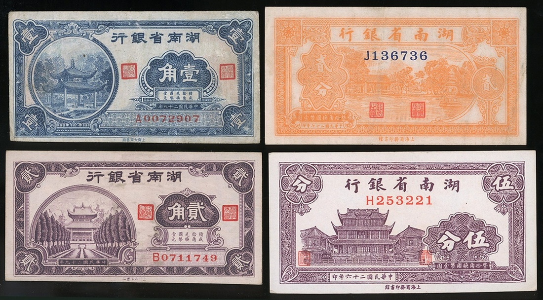 1937至40年湖南銀行紙幣4枚一組,面額由2分至2角,VF至EF品相,紙身發黃