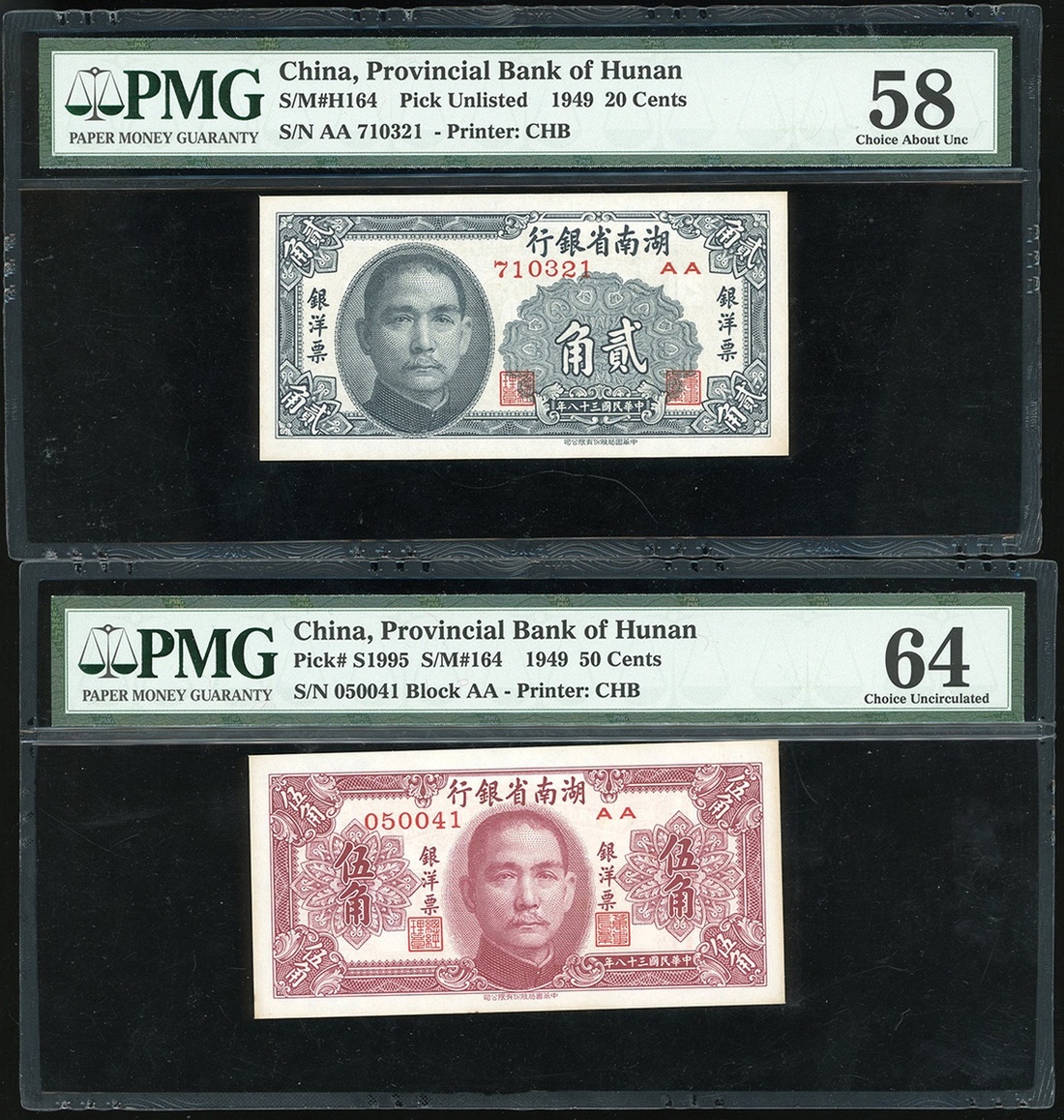 Provincial Bank of Hunan, a pair of 20 cents and 50 cents, 1949, serial numbers AA710321 and AA050041,