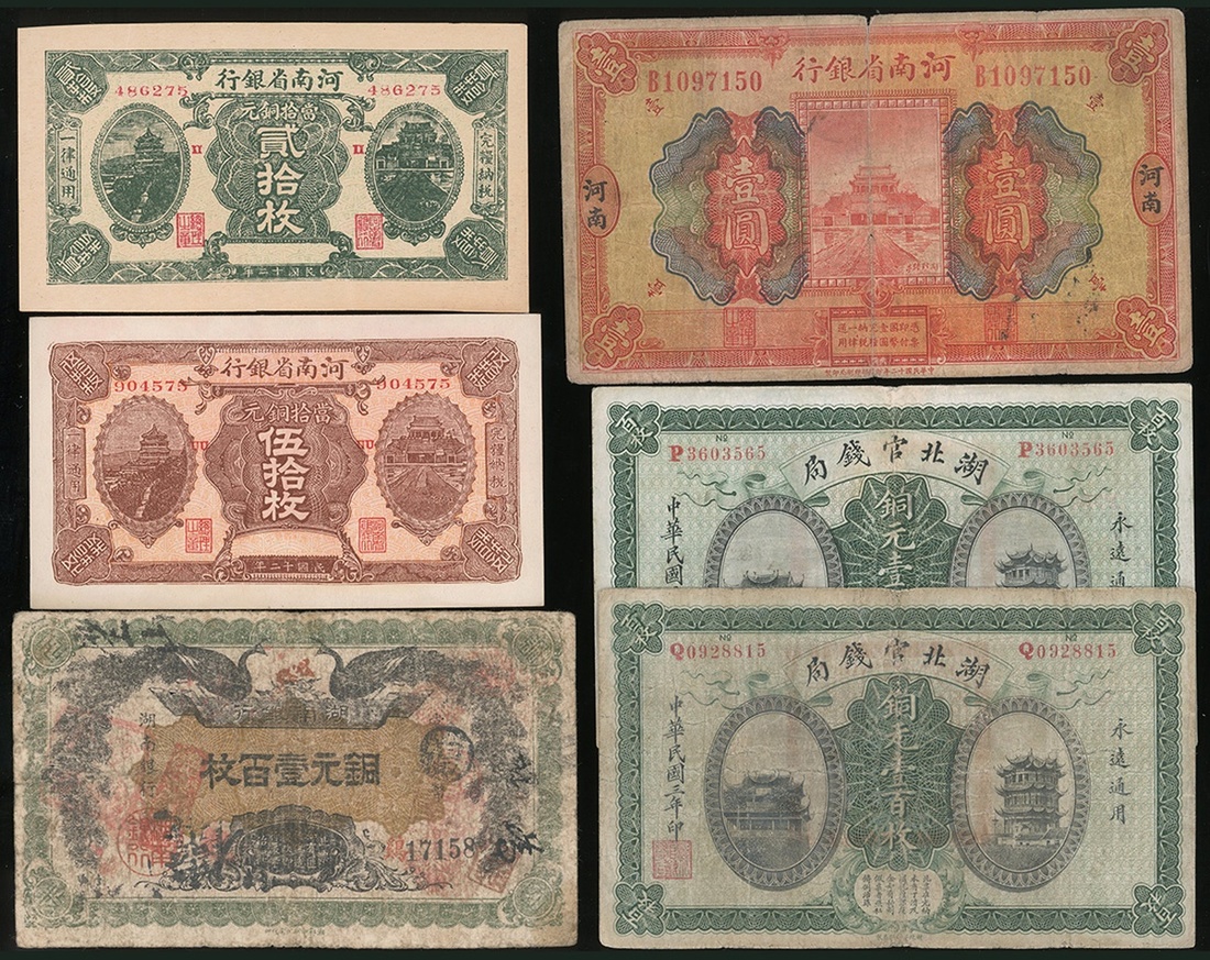Provincial Notes, a group of 6x notes from the following banks: Provincial Bank of Hunan, 100 copper coins 1912, serial number 17158; The Hupeh Provincial Bank, 100 copper coins (2), 10.9.1914, serial numbers P3603565 and Q0928815; The Provincial Bank of Honan, 20 copper coins, 50 copper coins, 1 yuan, Honan, 1931, serial numbers 486275, 904575, and B1097150,