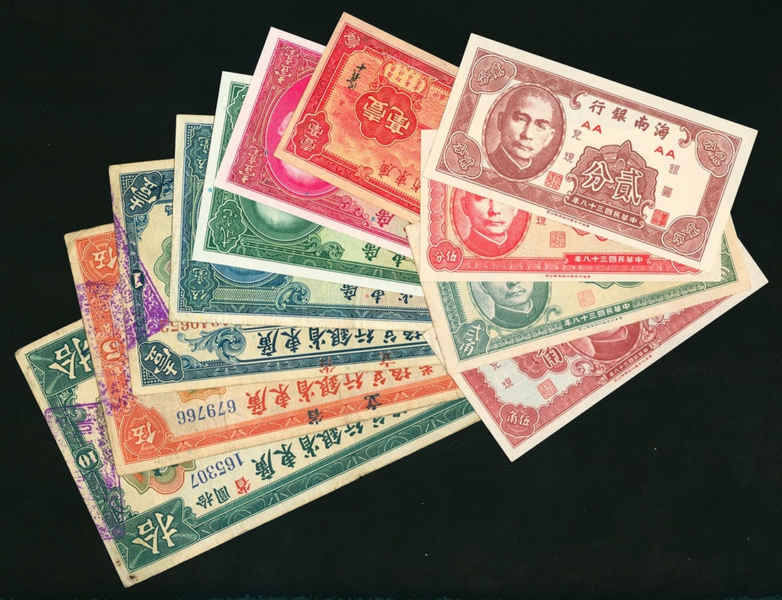 Republican Era, a lot of 11x notes from various dates and issuing banks, Provincial Bank of Kwangtung Province, 1 yuan, 5 yuan, 10 yuan, 1918; Hainan Bank, 2 cents, 5 cents, 20 cents, 50 cents, 1949; Kwangtung Provincial Bank, 10 cents (2), 20 cents, 50 cents, 1934-1935,