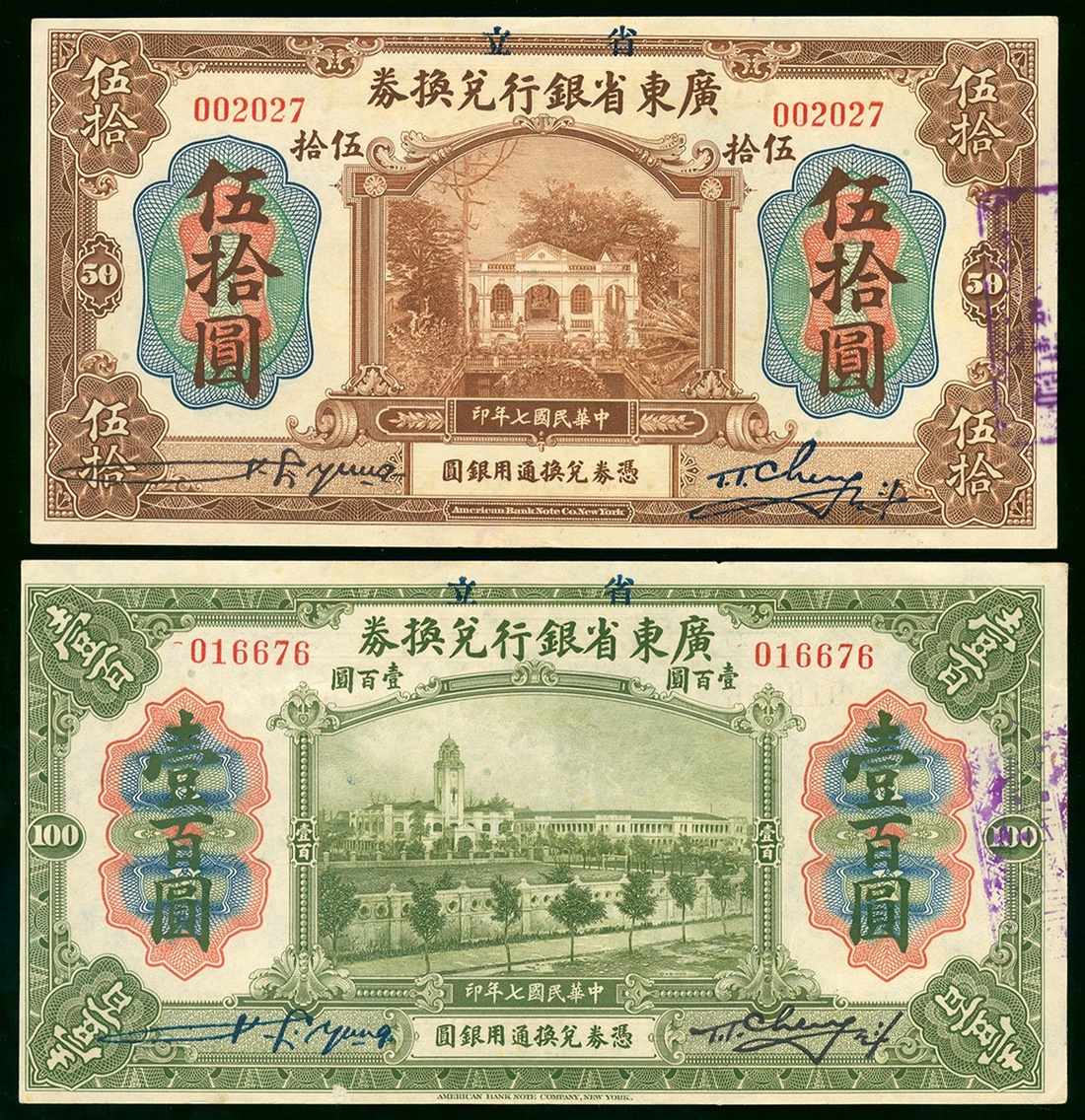 The Provincial Bank of Kwang Tung Province, a pair of 50 and 100 yuan, 1.1.1918, serial number 002027 and 016676, blue seal at right,