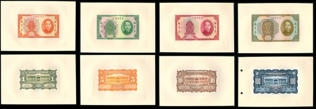 The Kwangtung Provincial Bank, a set of 4x uniface obverse and reverese proof pairs on card, 1931, consisting of 1, 5, 10 and 100 yuan, printed by ABNC,