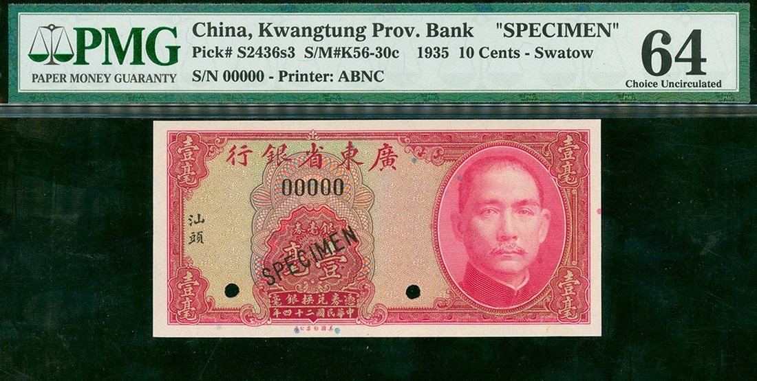 The Kwantung Provincial Bank, 10 cents, Swatow, specimen, 1935, serial number 00000, (Pick S2436s3), PMG 64 Choice Uncirculated.