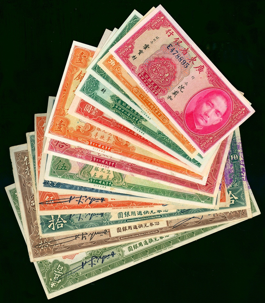 Provincial Bank of Kwangtung, a group of 13 notes, The Provincial Bank of Kwang Tung Province, 50 cents, 1, 5, 10, 50 and 100 Yuan, 1918-1922; The Kwangtung Provincial Bank, 10 cents, 20 cents (2), 1 Yuan (2), 5 Yuan and 10 Yuan, 1931-1940, one 20 cents note with red overprint in Chinese with 'Defeat the Japanese Warlords',