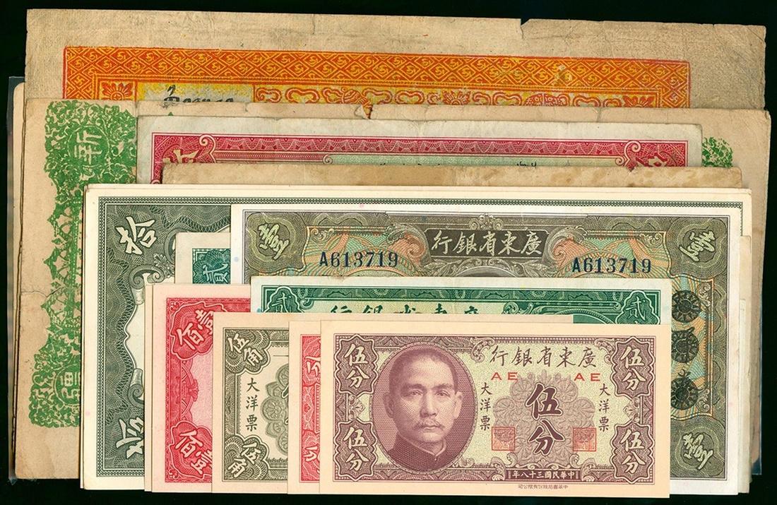 Republican Era, a group of 43x notes, better conditioned including: Kwangtung Provincial Bank, 5 fen to 100 yuan, the Farmer's Bank of China, 1 jiao to 1 yuan, (Pick various), mixed condition but mainly very fine to about uncirculated, viewing recommended, sold as seen no returns (43)