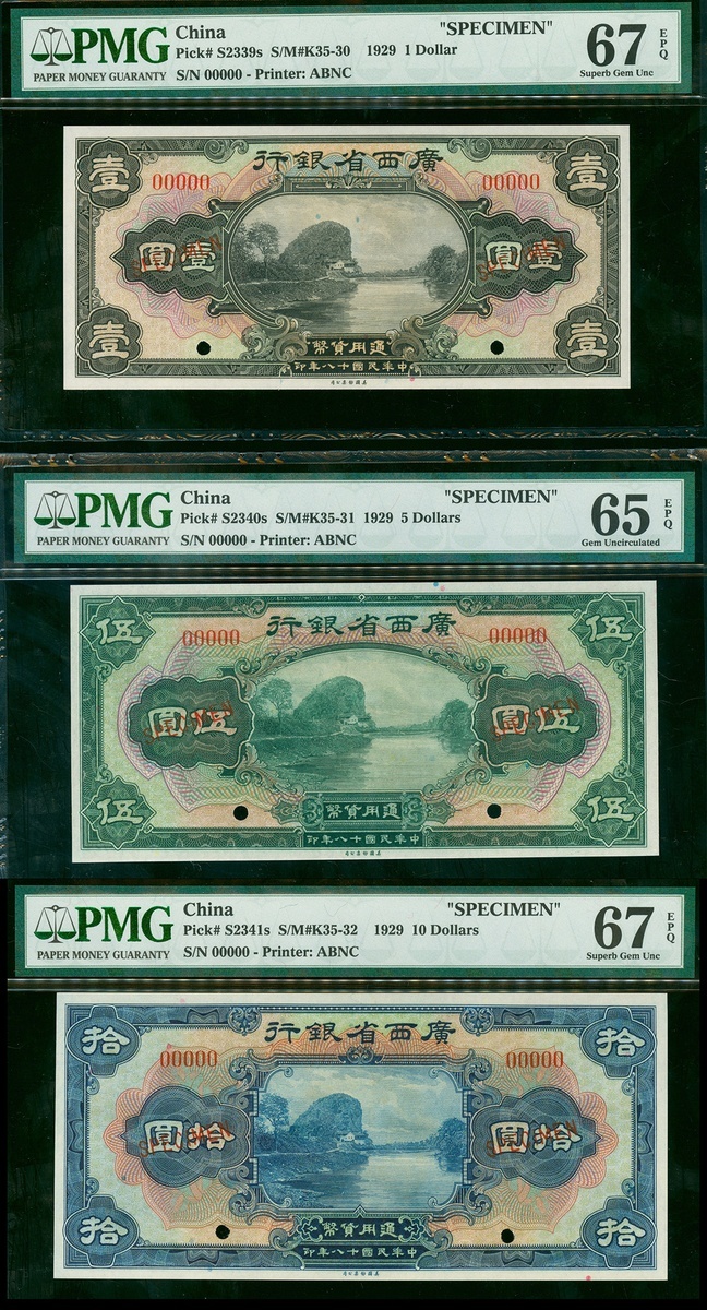 民國十八年廣西省銀行樣票3枚,壹、伍及拾圓 ,PMG 65EPQ至67EPQ