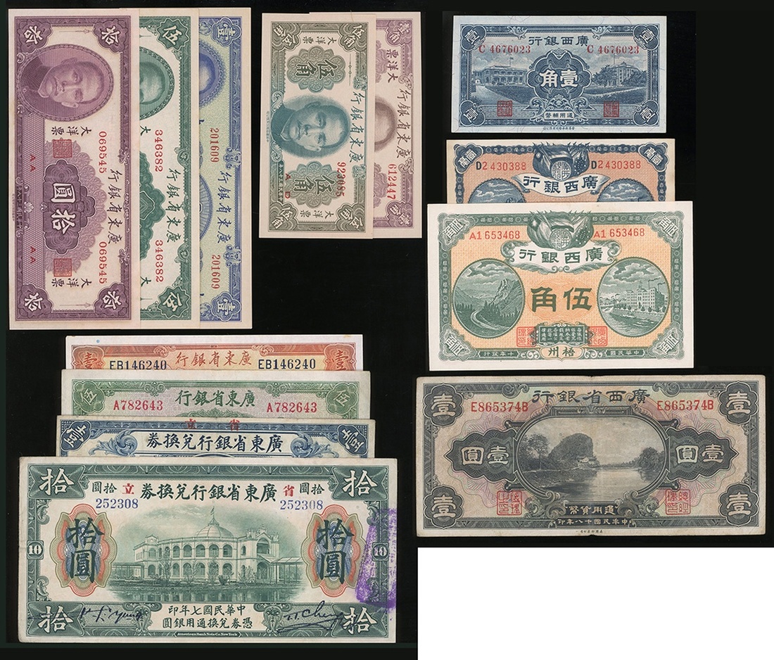 Kwangtung/Kwangsi Provinces, a group of 13x notes including: Kwangsi Bank, 10 cents, 10 and 50 cents, Wuchow, 1 yuan, 1920-1936; The Kwangtung Provincial Bank, 10 cents, 50 cents, 1 yuan (2), 5 yuan (2), 10 yuan, 1931-1949; The Provincial Bank of Kwangtung Province, 1 yuan, 10 yuan, 1.1.1918,