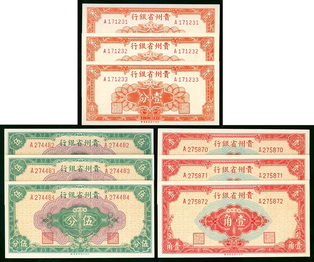 The Provincial Bank of Kwei Chow, 3 sets of fractional notes, 1949, consisting of 1 cent, serial numbers A171231-33, 5 cents, serial numbers A274482-84 and 10 cents, serial numbers A275870-72, printed by ABNC,