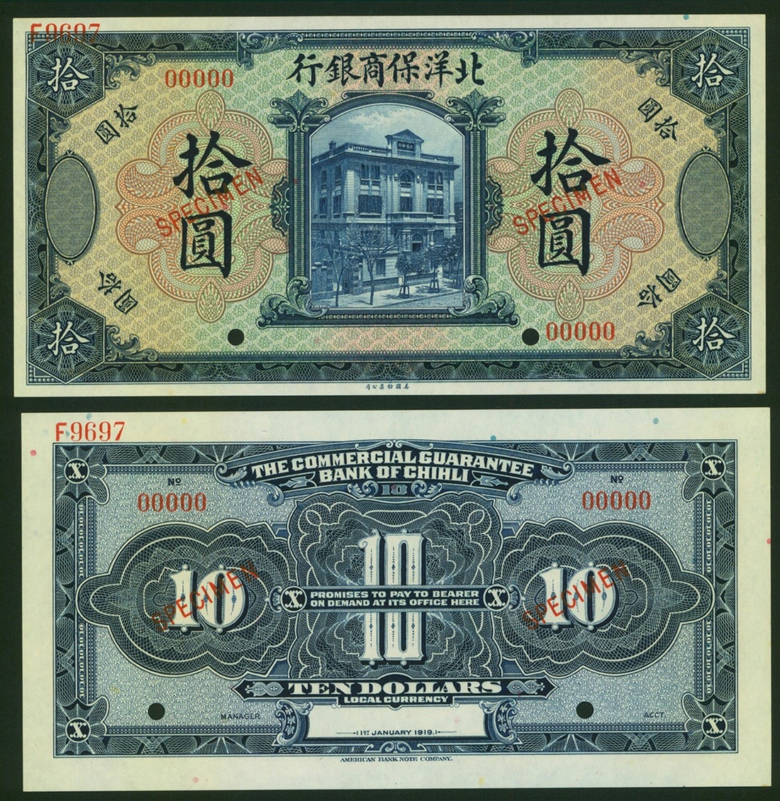 The Commercial Guarantee Bank of Chihli, 10 Yuan, uniface obverse and reverse punch hole cancelled specimen notes, 1.1.1919, control number F9697, (Pick S2516s), uncirculated (1 pair)