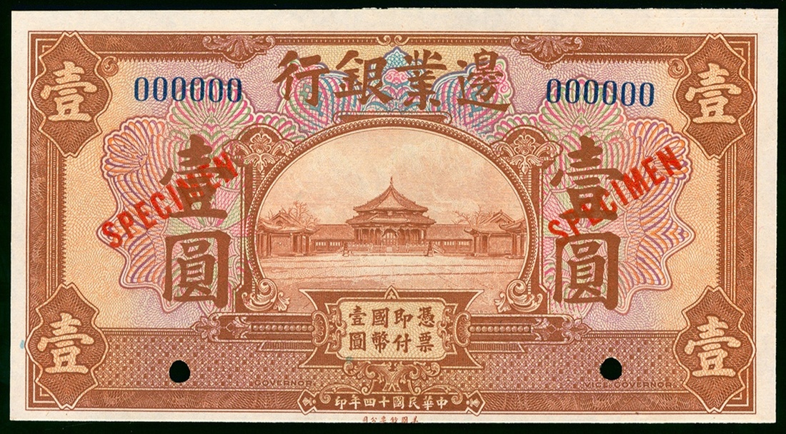 Frontier Bank, 1 yuan, Tientsin, specimen, 1.7.1925, serial number 000000, (Pick S2569s), uncirculated.