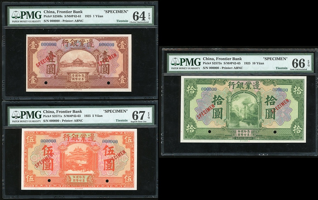 Frontier Bank, 1, 5, 10 Yuan, 1925, serial numbers 000000, specimens, Tientsin, (Pick S2569s, S2571s, S2573s), PMG64EPQ-PMG67EPQ, Choice Uncirculated to Superb Gem Uncirculated (3)