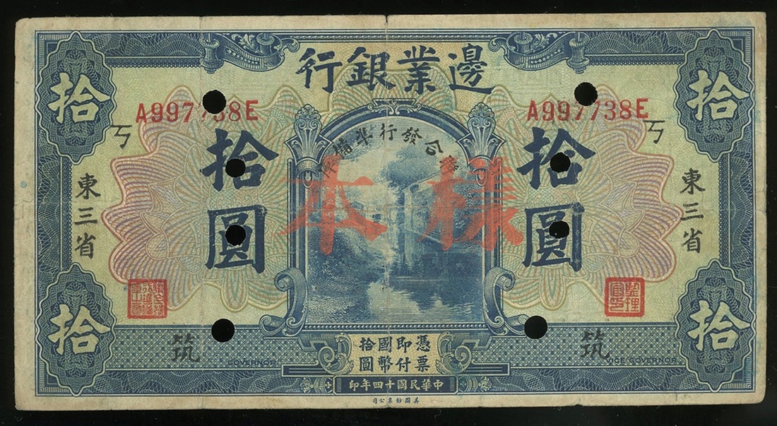 1925年邊業銀行10元樣鈔,東三省地名,VG品相,中間有孔,紙自有黃及角位有裂
