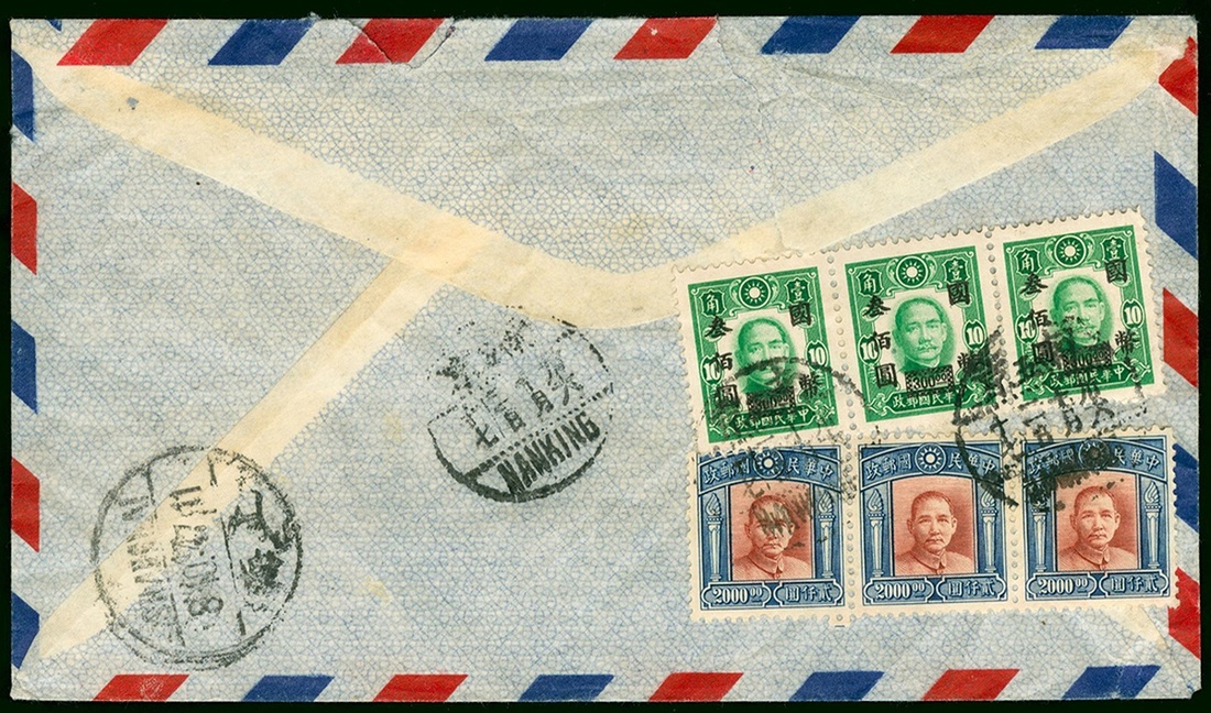 1947 (2 Oct.) a registered air mail cover to Belgium bearing $6900 tied by Nanking c.d.s. last day used of this postal rate.