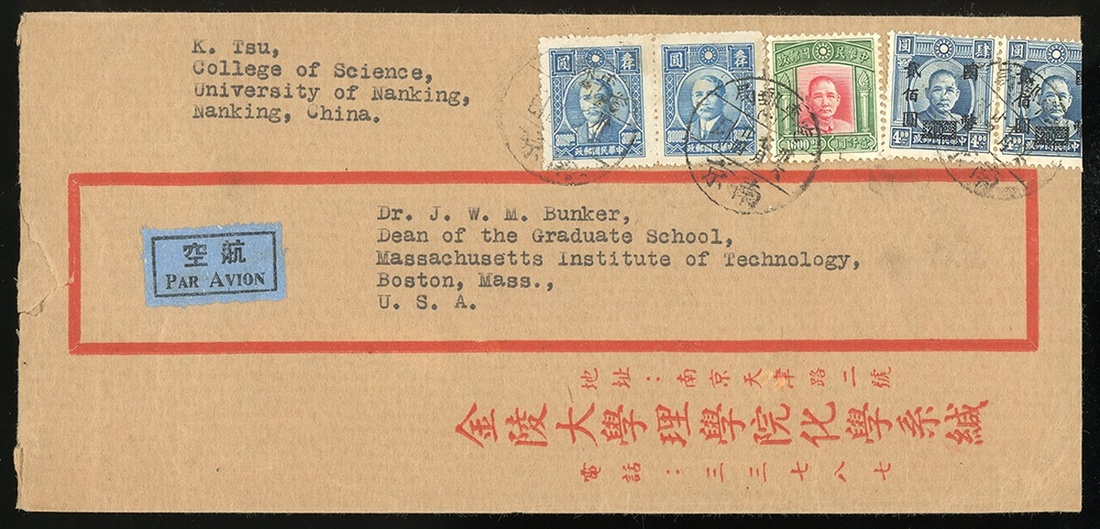 1947年南京寄美國航空封1件,貼孫像及加蓋國幣郵票5枚,合資7400元,銷南京汽車郵局7月24日戳,郵戳清晰,保存完好