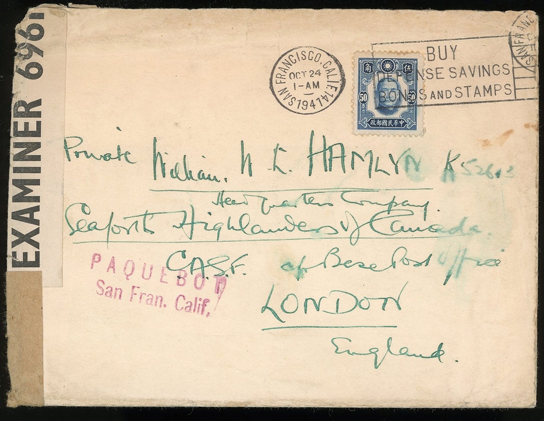 1941年寄倫敦輪船郵件實寄封1件,貼紐約版孫像50分1枚,銷三藩市10月24日機蓋戳,另蓋三藩市輪船郵件紅色副戳,郵件經檢查,貼檢查封條,保存完好