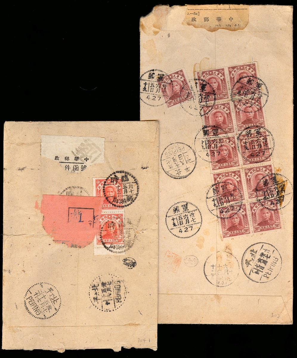 1948 (13 May) a double registered cover to Peiping bearing $500 and $1000 pair tied by Military PO No.384 c.d.s., another registered air mail cover to Peiping bearing $200 x 11 tied by Military PO No.427 (5.6.) c.d.s.