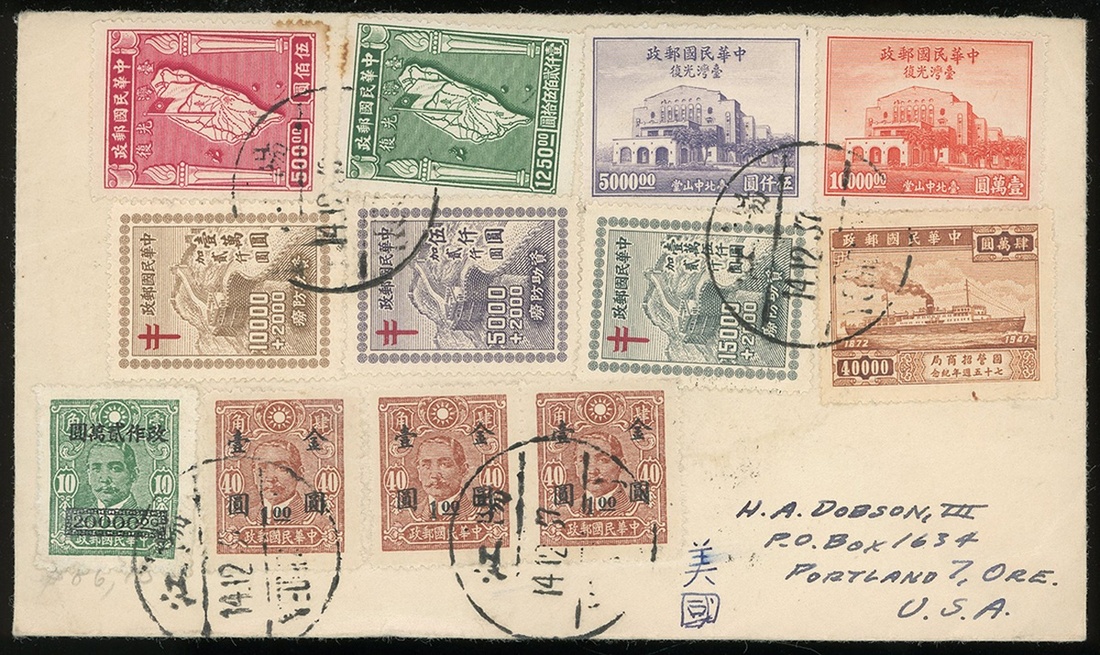 1948年陽江寄美國實寄封1件,貼孫像長框改作,臺灣光復,防癆附捐等國幣郵票9枚,孫像加蓋金元1元3枚,國幣郵票合資10.675萬元,銷陽江12月14日戳,有廣州16日中轉戳,保存完好