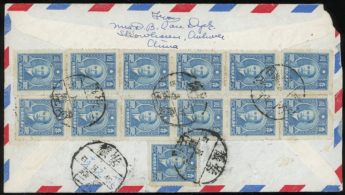 1948年安徽貢縣寄美國航空封1件,貼上海大東一版孫像3000元13枚(含大方連),銷安徽貢縣三格式日期手填戳,手填日期6月16日,郵戳清晰,保存完好,少見