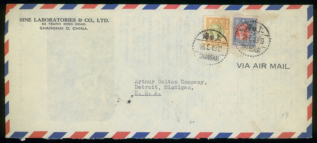 1948年上海寄美國航空封1件,貼上海大東二版孫像1萬元10萬元各一枚,銷上海5月18日戳,保存完好,此封為國際航空郵資調資尾日封