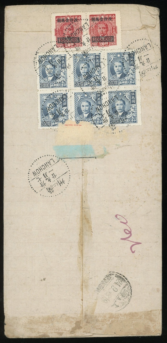 1948年蘭州寄上海航空報值雙掛號封1件,貼孫像加蓋長框改作1萬元2枚,上海大東三版孫像5萬元六方連,銷蘭州9月21日戳,另蓋黑色蘭州郵局報值掛號信函戳,有上海9月24日到達戳,封背貼有報值掛號殘條,保存完好,寄信人為1949年新疆9.25起義少將詹若標