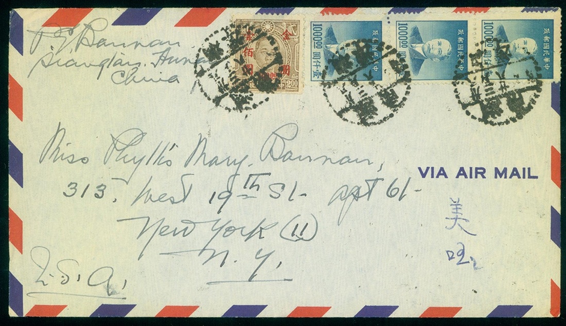 1948年湖南湘潭寄美國航空封1件,貼上海大東一版孫像金元1000元3枚,孫像加蓋國幣100元1枚,銷湖南湘潭3月28日戳,保存完好,寄信人為常德廣德醫院(今常德第一醫院)第三任院長巴天明先生,收信人是其女兒巴玉華,為美國東洛杉磯學院歷史學教授,著名湖南抗戰歷史專家,曾著有多部相關湖南抗戰史書籍
