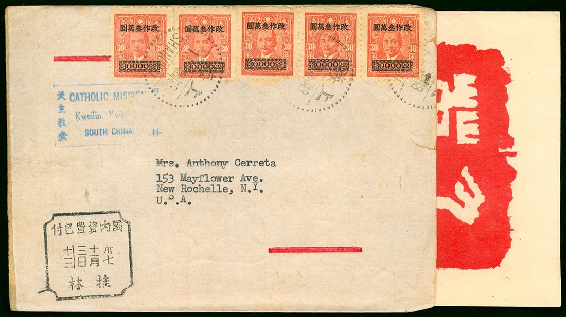 1948年桂林天主教堂經上海寄美國實寄封1件,信封貼中信版孫像30分粗齒加蓋長框改作3萬元橫五連,封左下角空白處銷桂林11月3日國內資費已付戳寄上海,而後由上海使用12月1日戳蓋銷郵票寄往美國,內附原始美術賀卡1張,保存完好,此種實寄國外形式非常少見
