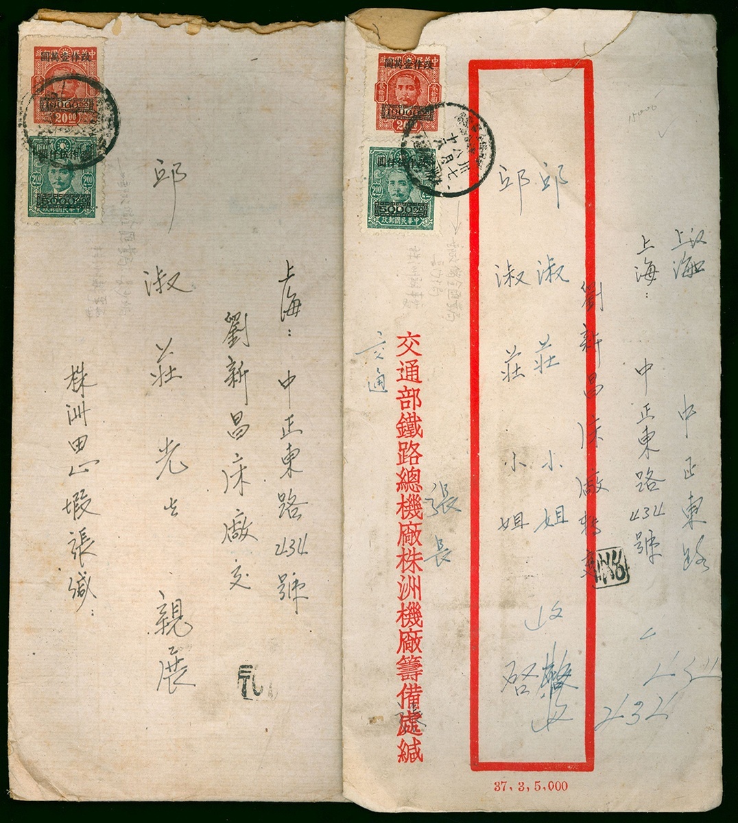 1948 two covers to Shanghai, bearing Dr S.Y.S. issue paying $15000, tied by Changsha, Chuchow c.d.s., with Shanghai arrival c.d.s., fine. (2)