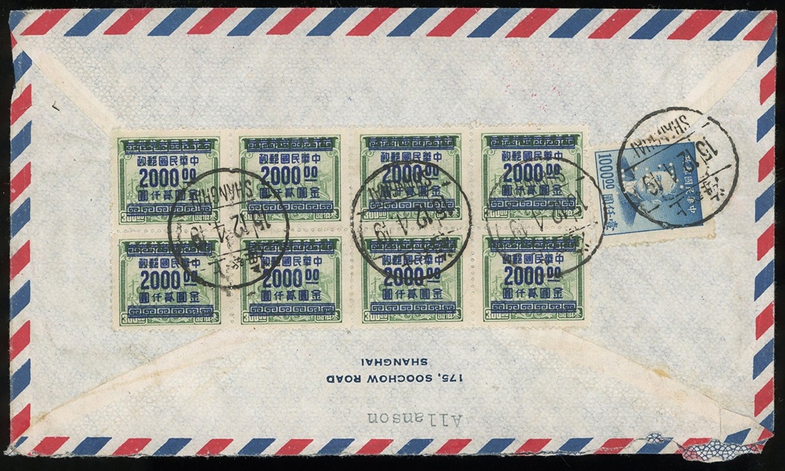 1949 (12 Apr.) air mail cover to U.S.A. bearing, on the reverse, Dr.Sun punched $1000, Gold Yuan $2,000 on $300 revenue stamp block of eight, tied by Shanghai c.d.s., fine.
