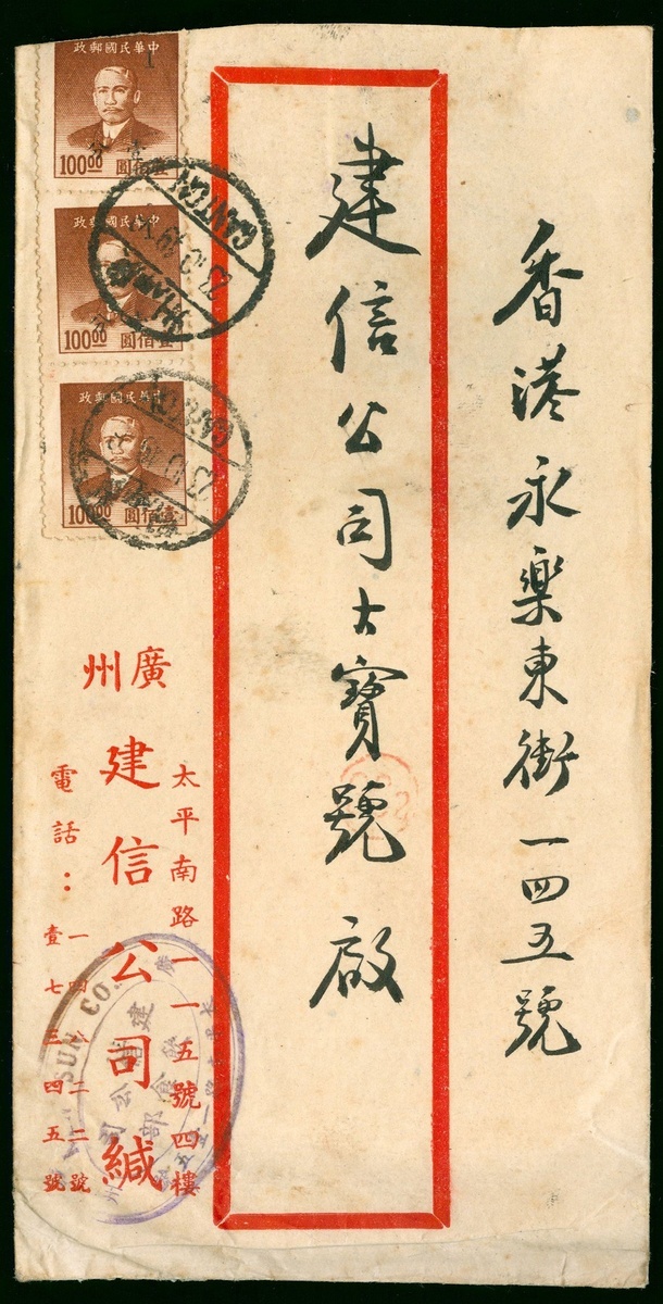 1949年廣州寄香港實寄封1件,貼孫像廣州加蓋銀元1分直三連(背面另有2枚郵票脫落),銷廣州10月23日戳,保存完好,此封為廣州解放後銀元郵票延用實例,少見
