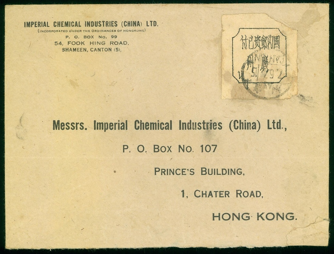 1949 (7 May) a envelope to Hong Kong bearing Canton postage paid label tied Canton c.d.s.