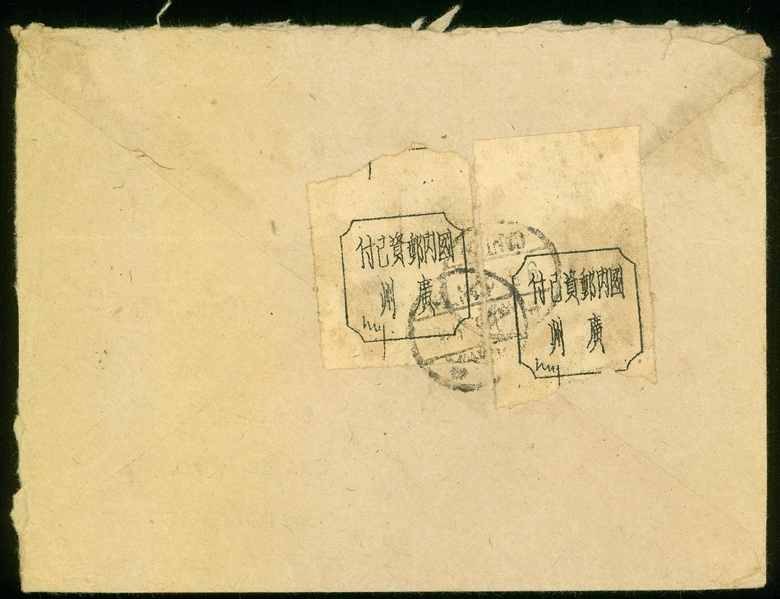 1949 (9 May) a envelope to Hong Kong bearing 2 Canton postage paid labels tied by Canton c.d.s.