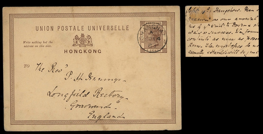 1883 (Sept.) Hong Kong 3c. postage card, handcarry from Hangchow to Shanghai, tied by British Post in Shanghai c.d.s. (14.9). Since the postal system was not opened in Hangchow in 1883, the postage card was taken to Shanghai. Card with Hong Kong transit c.d.s. (16.9). Well-preserved, pre-historic mail for Hangchow Post, rare