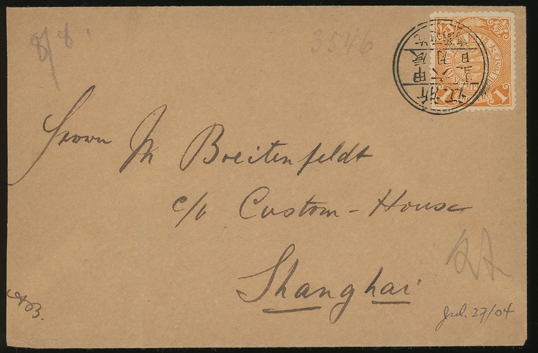 1904年杭州寄上海實寄封1件,貼倫敦版蟠龍1分1枚,銷浙江杭通商場甲辰六月二十五日雙圈三格干支戳,有上海8月8日工部小圓戳,郵戳清晰,保存完好