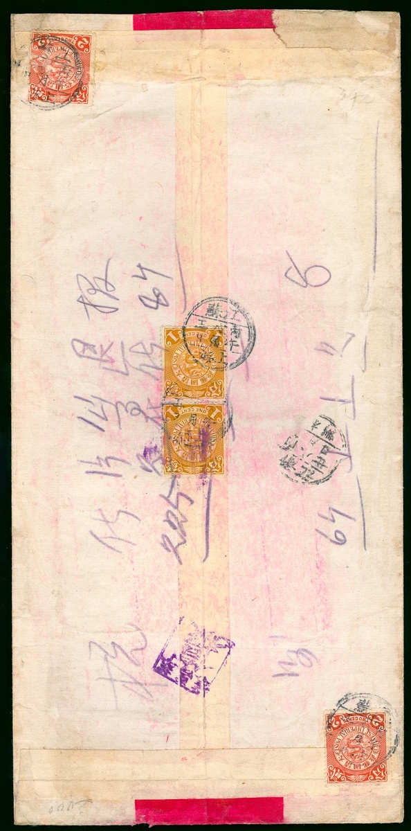 1906 (12 Aug.) large red band cove to Hangchow, on the reverse, bearing C.I.P. 1c. (2) and 2c. (2), tied by Shanghai luner c.d.s., also with Suichang letter box cancel in purple and Hangchow arrival c.d.s. (20.8)