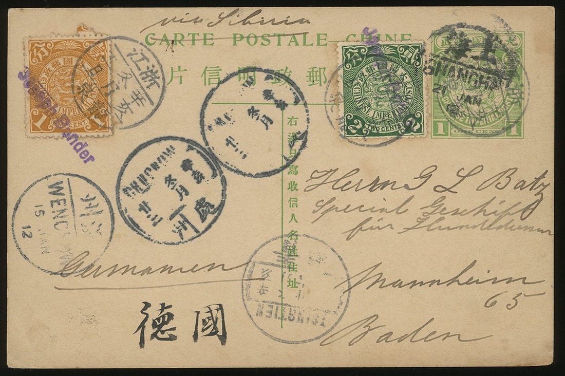 1912 (9 Jan.) 1c. Coiling Dragon card to Germany added 1c. and 2c. with private chop tied by Lungchuan lunar c.d.s. via Tsingrien, Chuchow,Wenchow and Shanghai .