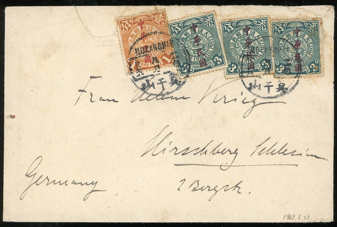 1913年莫干山寄德國實寄封1件,貼倫敦版蟠龍加蓋楷體中華民國1分1枚,3分3枚,銷莫干山二年八月二十五英漢腰框戳,經上海中轉,有上海8月26日小圓戳,保存完好