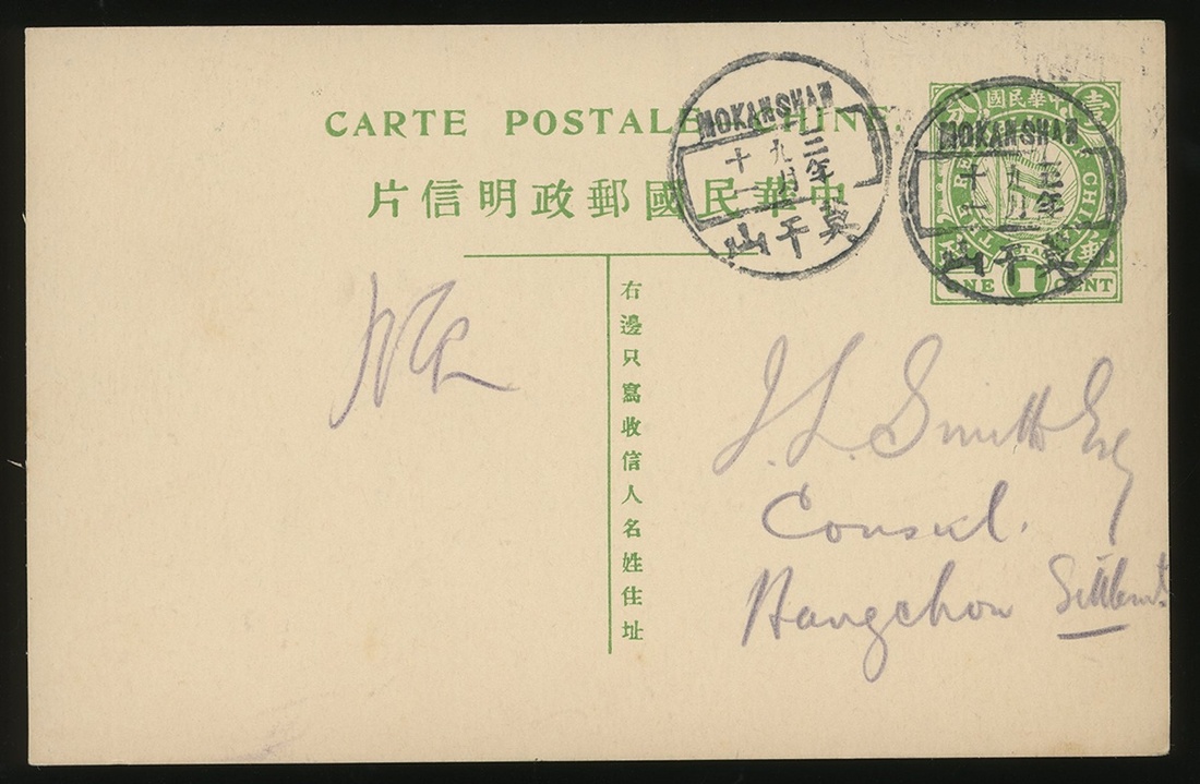 1914 (11 Sep.) 1c. Flag to Hangchow tied by Mokanshan bilingual c.d.s.