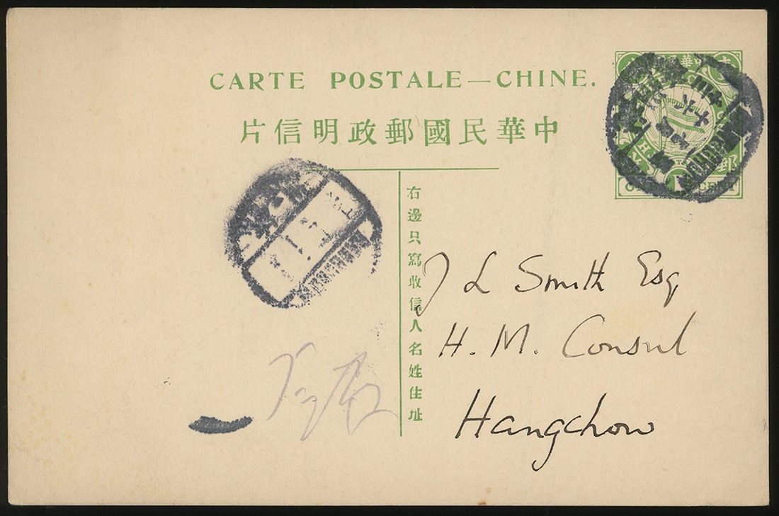 1914 (16 Jul.) 1c. flag stationery card to local tied by Hangchow c.d.s. with missing Chinese char. ‘Year’, very unusual.