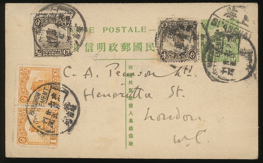 1917 (25 Jul.) 1c. Junk added 3c. to London tied by scarce ‘HANGCHOW SETTLEMENT’ c.d.s., plus incoming postcard to Hangchow Settlement.
