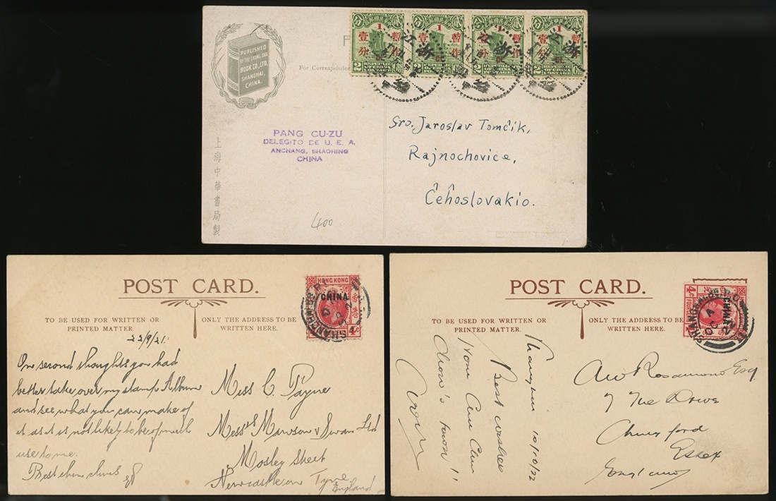 1922-35年實寄杭州風光明信片3件不同,分別貼帆船加蓋1分4枚,及單貼香港加蓋CHINA客郵4分,銷上海英國可郵戳,或浙江紹興戳,片背圖包括西湖西溪探梅等,整體保存完好,請預覽