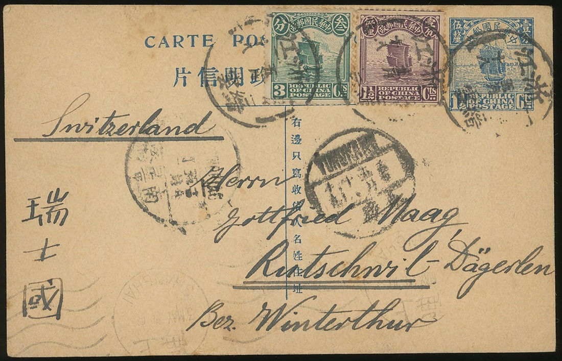 1924年浙江縉雲寄瑞士第二版帆船1.5分郵資片1件,加貼北京一版帆船1.5分3分各一枚,銷浙江縉雲(鏟字)5月18日腰框戳,經南橋,永嘉,上海中轉,有三地中轉戳,郵路清晰,保存完好