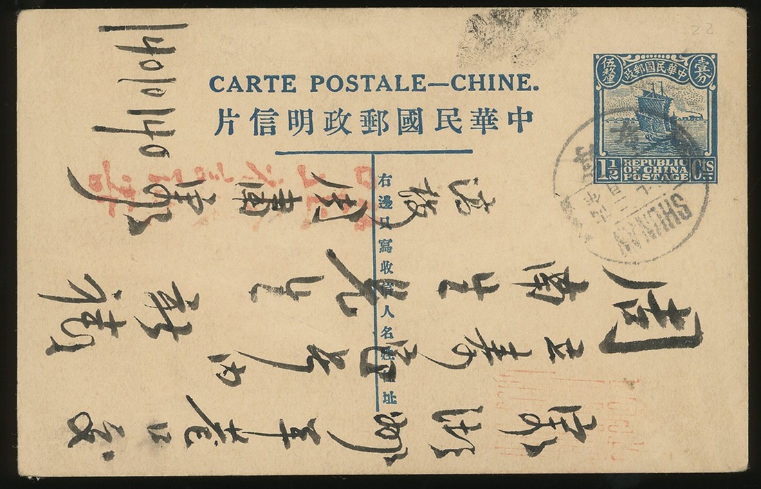 1925 (7 Feb.) Junk 1.5c. postage card from Shunan to Huchow, tied by Shunan c.d.s., on the reverse with Zakow transit c.d.s. (8.2) and Huchow arrival c.d.s. (11.2).